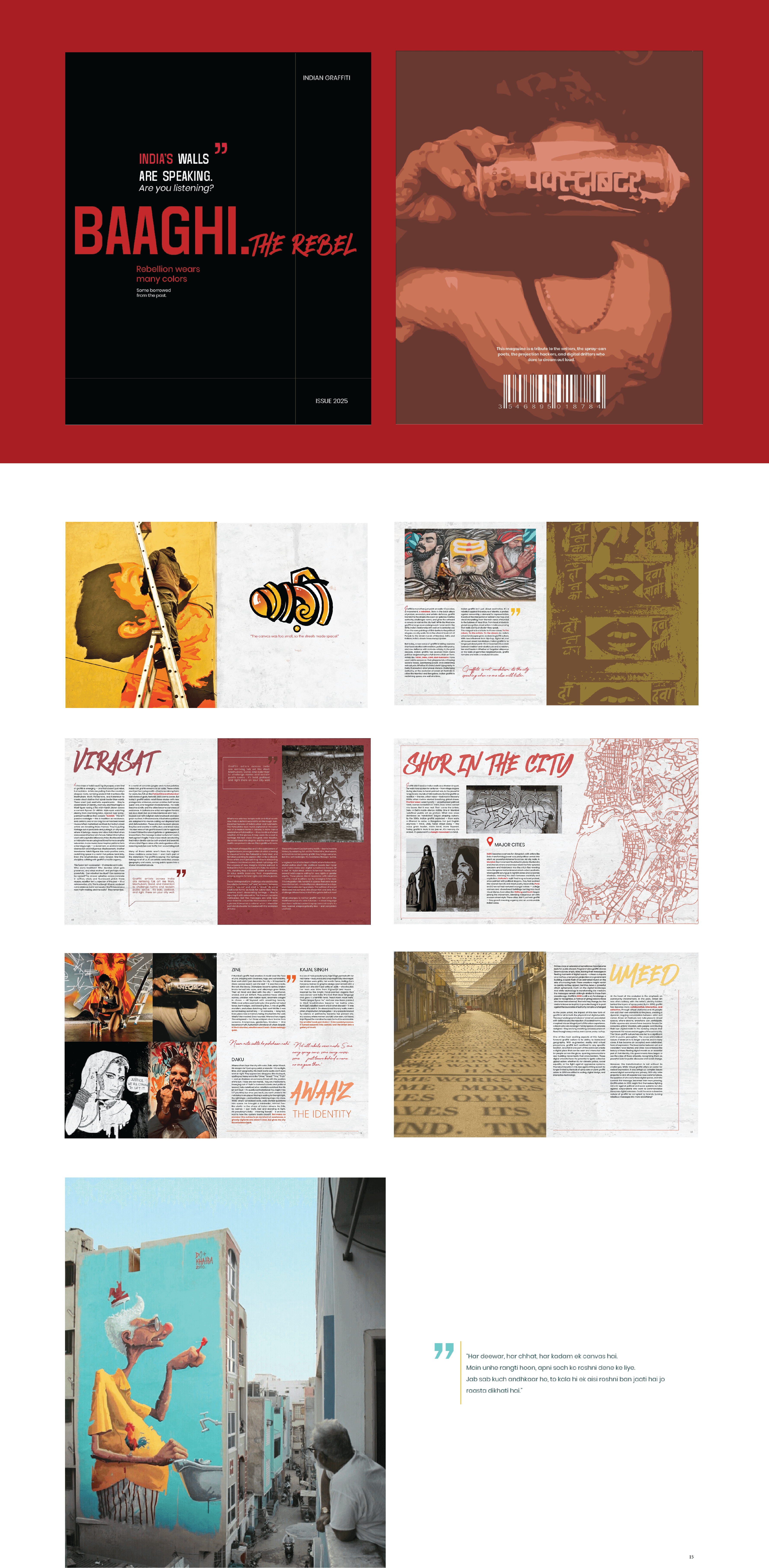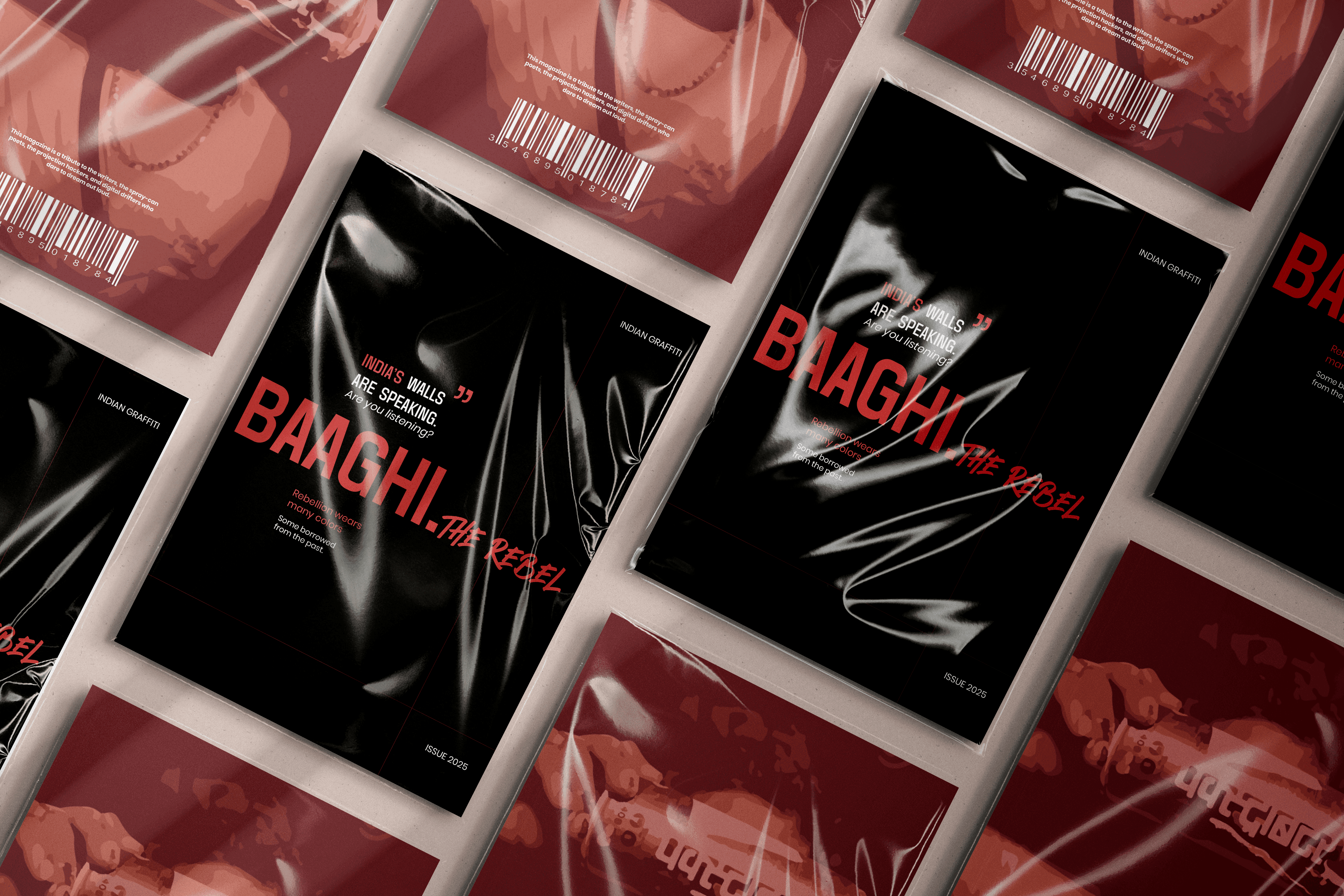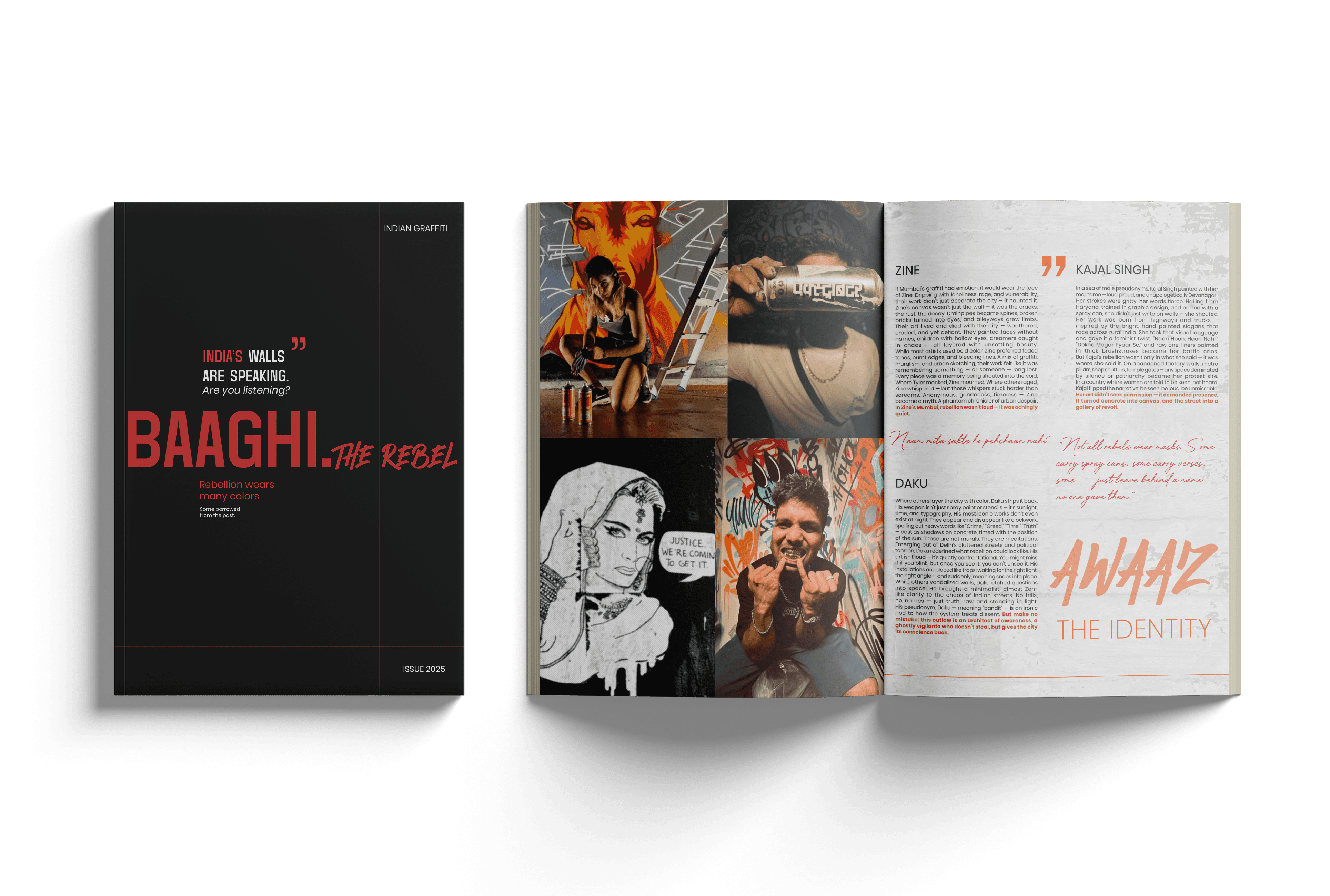 BAAGHI is more than a magazine , it’s a rebellion in print. Centered on the evolution of Indian graffiti, this 16-page visual journal explores how public walls across the country have become canvases of protest, poetry, and power.ach spread blends sharp editorial writing with layered visuals, offering a gritty yet poetic lens into India’s rebellious visual underground.
