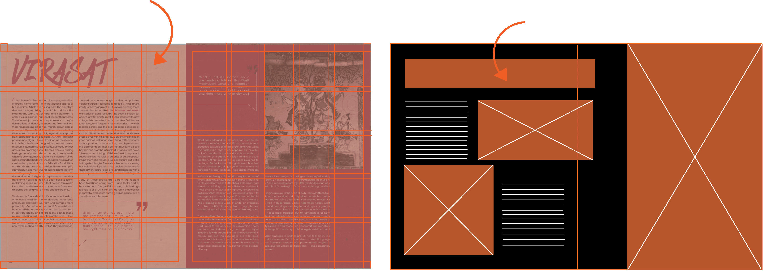 The grid also accommodates a baseline alignment for body text, while headlines like "Virasat" and "Shor in the City" intentionally break the grid for expressive impact.